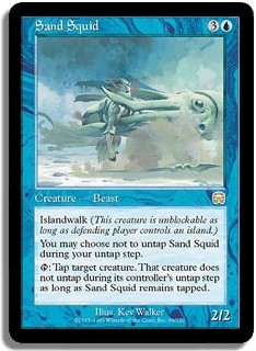 Islandwalk (This creature is unblockable as long as defending player controls an island.) You may choose not to untap Sand Squid during your untap step. T: Tap target creature. That creature doesn't untap during its controller's untap step as long as Sand Squid remains tapped.
