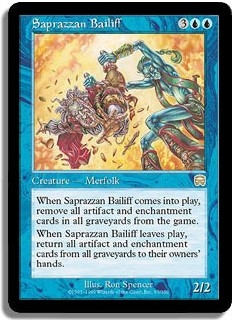 When Saprazzan Bailiff comes into play remove all artifact and enchantment cards in all graveyards from the game. When Saprazzan Bailiff leaves play return all artifact and enchantment cards from all graveyards to their owners' hands.