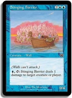 (Walls can't attack.) U T: Stinging Barrier deals 1 damage to target creature or player.
