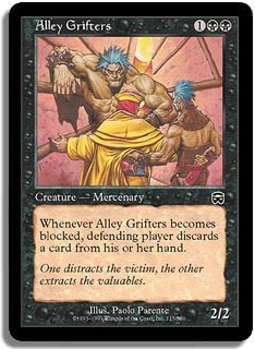 Whenever Alley Grifters becomes blocked defending player discards a card from his or her hand.