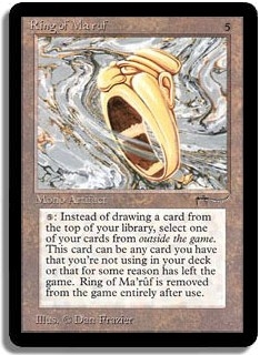 <5>: Instead of drawing a card from the top of your library, select one of your cards from OUTSIDE THE GAME. This card can be any card you have that you're not using in your deck or that for some reason has left the game. Ring of Ma'ruf is removed from the game entirely after use.