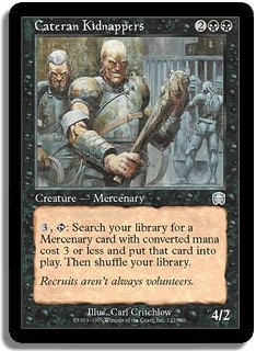 3 T: Search your library for a Mercenary card with converted mana cost 3 or less and put that card into play. Then shuffle your library.