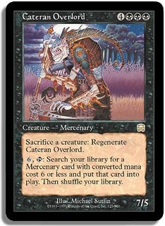 Sacrifice a creature: Regenerate Cateran Overlord. 6 T: Search your library for a Mercenary card with converted mana cost 6 or less and put that card into play. Then shuffle your library.