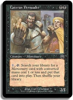 1 T: Search your library for a Mercenary card with converted mana cost 1 or less and put that card into play. Then shuffle your library.