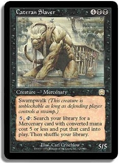 Swampwalk (This creature is unblockable as long as defending player controls a swamp.) 5 T: Search your library for a Mercenary card with converted mana cost 5 or less and put that card into play. Then shuffle your library.