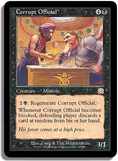 2B: Regenerate Corrupt Official. Whenever Corrupt Official becomes blocked defending player discards a card at random from his or her hand.