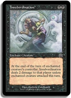 At the end of the turn of enchanted creature's controller Insubordination deals 2 damage to that player unless enchanted creature attacked this turn.