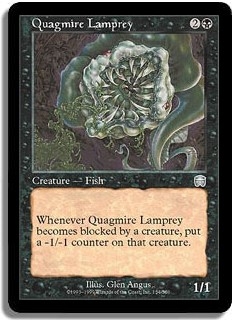 Whenever Quagmire Lamprey becomes blocked by a creature put a -1/-1 counter on that creature.