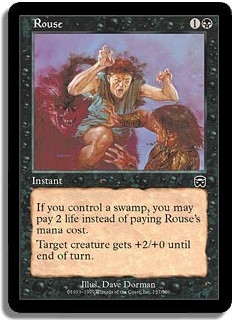 If you control a swamp you may pay 2 life rather than pay Rouse's mana cost. Target creature gets +2/+0 until end of turn.