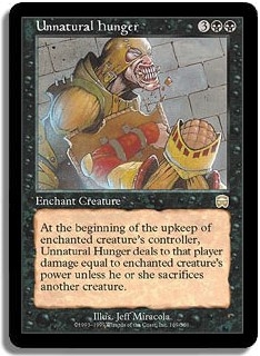 At the beginning of the upkeep of enchanted creature's controller Unnatural Hunger deals to that player damage equal to enchanted creature's power unless he or she sacrifices another creature.