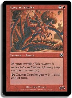 Mountainwalk (This creature is unblockable as long as defending player controls a mountain.) R: Cavern Crawler gets +1/-1 until end of turn.