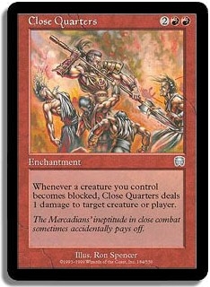 Whenever a creature you control becomes blocked Close Quarters deals 1 damage to target creature or player.