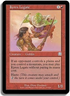 If an opponent controls a plains and you control a mountain you may play Kyren Legate without paying its mana cost. Haste (This creature may attack and T the turn it comes under your control.)
