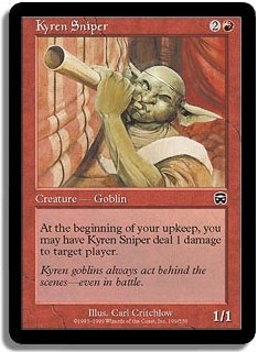 At the beginning of your upkeep you may have Kyren Sniper deal 1 damage to target player.
