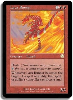 Haste (This creature may attack and T the turn it comes under your control.) Whenever Lava Runner becomes the target of a spell or ability that spell or ability's controller sacrifices a land.