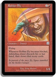Flying Whenever Robber Fly becomes blocked defending player discards his or her hand then draws that many cards.