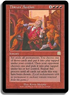Set aside all nontoken permanents. You choose one of those cards and put it into play tapped under your control. Then your opponent chooses one and puts it into play tapped under his or her control. Repeat this process until all cards set aside this way have been chosen. (Local enchantments with no permanent to enchant remain removed from the game.)