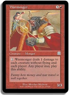 2: Warmonger deals 1 damage to each creature without flying and each player. Any player may play this ability.
