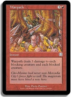 Warpath deals 3 damage to each blocking creature and each blocked creature.