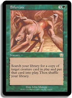 Search your library for a creature card with the same name as target creature and put that card into play. Then shuffle your library.