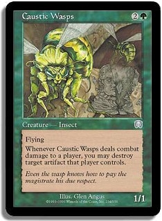 Flying Whenever Caustic Wasps deals combat damage to a player you may destroy target artifact that player controls.