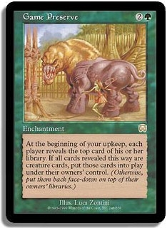At the beginning of your upkeep each player reveals the top card of his or her library. If all cards revealed this way are creature cards put those cards into play under their owners' control. (Otherwise put them back face-down on top of their owners' libraries.)