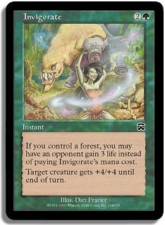 If you control a forest you may have an opponent gain 3 life rather than pay Invigorate's mana cost. Target creature gets +4/+4 until end of turn.