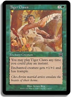 You may play Tiger Claws any time you could play an instant. Enchanted creature gets +1/+1 and has trample.