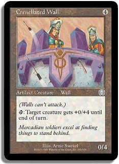 (Walls can't attack.) T: Target creature gets +0/+4 until end of turn.