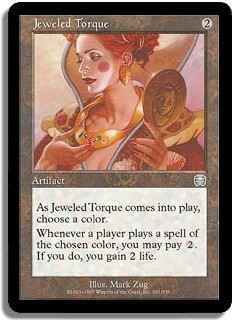 As Jeweled Torque comes into play choose a color. Whenever a player plays a spell of the chosen color you may pay 2. If you do you gain 2 life.