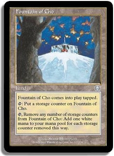 Fountain of Cho comes into play tapped. T: Put a storage counter on Fountain of Cho. T Remove any number of storage counters from Fountain of Cho: Add one white mana to your mana pool for each storage counter removed this way.