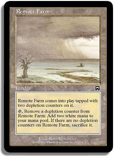 Remote Farm comes into play tapped with two depletion counters on it. T Remove a depletion counter from Remote Farm: Add two white mana to your mana pool. If there are no depletion counters on Remote Farm sacrifice it.
