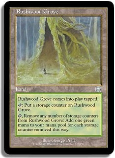 Rushwood Grove comes into play tapped. T: Put a storage counter on Rushwood Grove. T Remove any number of storage counters from Rushwood Grove: Add one green mana to your mana pool for each storage counter removed this way.