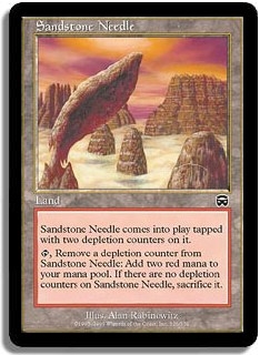 Sandstone Needle comes into play tapped with two depletion counters on it. T Remove a depletion counter from Sandstone Needle: Add two red mana to your mana pool. If there are no depletion counters on Sandstone Needle sacrifice it.