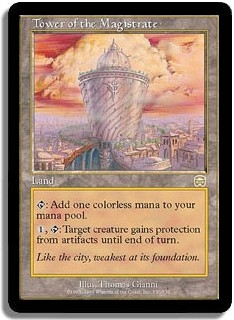 T: Add one colorless mana to your mana pool. 1 T: Target creature gains protection from artifacts until end of turn.
