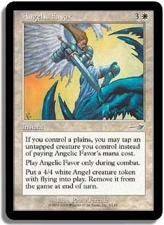 If you control a plains you may tap an untapped creature you control rather than pay Angelic Favor's mana cost. Play Angelic Favor only during combat. Put a 4/4 white Angel creature token with flying into play. Remove it from the game at end of turn.