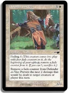 Fading 4 (This creature comes into play with four fade counters on it. At the beginning of your upkeep remove a fade counter from it. If you can't sacrifice it.) Remove a fade counter from Defender en-Vec: Prevent the next 2 damage that would be dealt to target creature or player this turn.