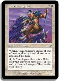 When Defiant Vanguard blocks at end of combat destroy it and all creatures it blocked this turn. 5 T: Search your library for a Rebel card with converted mana cost 4 or less and put that card into play. Then shuffle your library.