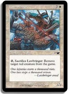 T Sacrifice Lawbringer: Remove target red creature from the game.
