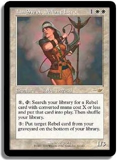 X T: Search your library for a Rebel card with converted mana cost X or less and put that card into play. Then shuffle your library. 3: Put target Rebel card from your graveyard on the bottom of your library.