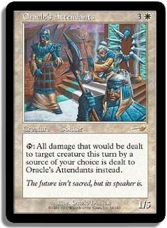 T: All damage that would be dealt to target creature this turn by a source of your choice is dealt to Oracle's Attendants instead.