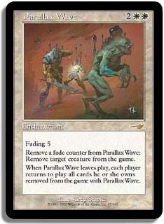 Fading 5 (This enchantment comes into play with five fade counters on it. At the beginning of your upkeep remove a fade counter from it. If you can't sacrifice it.) Remove a fade counter from Parallax Wave: Remove target creature from the game if Parallax Wave is in play. When Parallax Wave leaves play each player returns to play all cards other than Parallax Wave he or she owns removed from the game with Parallax Wave.