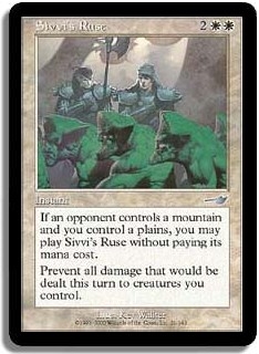 If an opponent controls a mountain and you control a plains you may play Sivvi's Ruse without paying its mana cost. Prevent all damage that would be dealt this turn to creatures you control.