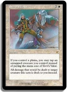 If you control a plains you may tap an untapped creature you control rather than pay the mana cost of Sivvi's Valor. All damage that would be dealt to target creature this turn is dealt to you instead.