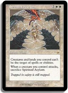 Creatures and lands you control can't be the target of spells or abilities. When a creature you control attacks sacrifice Spiritual Asylum.