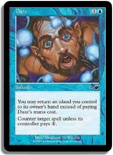 You may return an island you control to its owner's hand rather than pay Daze's mana cost. Counter target spell unless its controller pays 1.