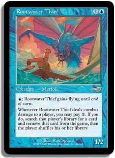 U: Rootwater Thief gains flying until end of turn. Whenever Rootwater Thief deals combat damage to a player you may pay 2. If you do search that player's library for a card and remove that card from the game then the player shuffles his or her library.