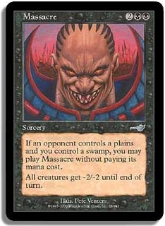 If an opponent controls a plains and you control a swamp you may play Massacre without paying its mana cost. All creatures get -2/-2 until end of turn.