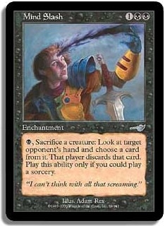 B Sacrifice a creature: Look at target opponent's hand and choose a card from it. That player discards that card. Play this ability only any time you could play a sorcery.