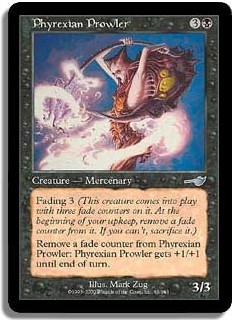 Fading 3 (This creature comes into play with three fade counters on it. At the beginning of your upkeep remove a fade counter from it. If you can't sacrifice it.) Remove a fade counter from Phyrexian Prowler: Phyrexian Prowler gets +1/+1 until end of turn.